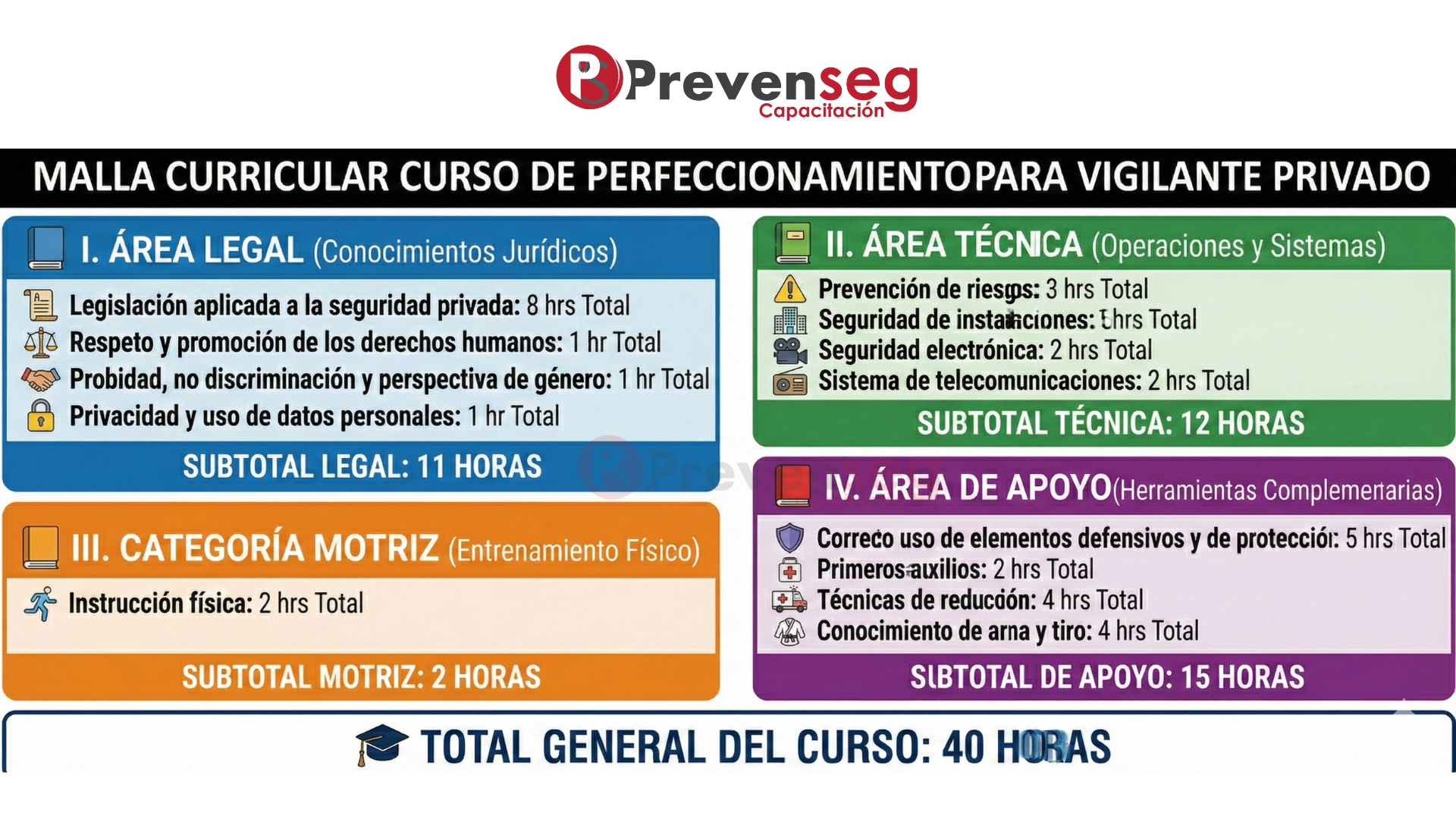 Con una duración de 40 horas, este curso está diseñado para organizaciones que desean preparar a su personal para roles de vigilante privado. Solo está disponible para empresas, y asegura que los participantes cuenten con las competencias necesarias para desempeñarse en tareas de vigilancia privada de alto nivel. Como todos nuestros cursos, está regularizado por la prefectura de Carabineros OS10 Ñuble.